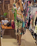 SPECIFICATIONS Style: Elegant Material: 5% Spandex,95% Polyester Dress Type: Shift dress Dress Length: Knee Length Neckline: V neck_V Pattern Type: Print Sleeve Length: Short Sleeve Fit Type: Regular Season: Spring, Summer, Fall Occasion: Daily Package Includes: 1 x Dress SIZE TABLE Size Bust Length Sleeves Shoulder ...