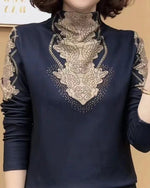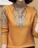 SPECIFICATIONS Top Type: Tops Style: Casual Material: Acrylic,Spandex,Polyester Occasion: Daily Neckline: Stand Collar Pattern Type: Solid Color Sleeve Type: Regular sleeve Sleeve Length: Long Sleeve Fit Type: Regular Season: Spring,Fall,Winter Details: Hot Drilling Package Includes: 1 x Top SIZE TABLE Size  Bust Length CM INCH CM I...
