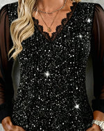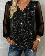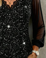V-Neck Fine Glitter Mesh Patchwork Loose Dress