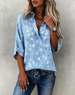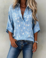SPECIFICATIONS Top Type: Tops Style: Casual Material: Cotton Blends Occasion: Daily Neckline: V neck_V Pattern Type: Print Sleeve Type: Regular sleeve Sleeve Length: 3/4 Sleeve Fit Type: Regular Season: Spring,Summer Package Includes: 1 x Top SIZE TABLE Size Bust Length CM INCH CM INCH S 92 36.22 65 25.59 M 96 37.8 66.5 26.18 L 10...