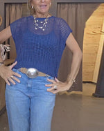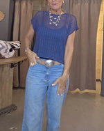 Women's Round Neck Hollow Knit Crochet Short Sleeve Sweater