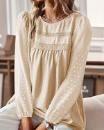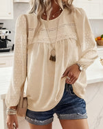 SPECIFICATIONS Top Type: Blouses Style: Casual Material: Cotton Blends,Lace Occasion: Daily Neckline: Round Neck Pattern Type: Solid Color Sleeve Type: Regular sleeve Sleeve Length: Long Sleeve Fit Type: Regular Season: Fall,Winter Details: Patchwork,Lace Package Includes: 1 x Blouse SIZE TABLE Size Bust Length CM INCH CM INCH S 92 36...