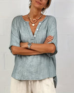 SPECIFICATIONS Top Type: Blouses Style: Casual Material: Denim Occasion: Daily Neckline: V neck_V Pattern Type: Solid Color Sleeve Type: Bat sleeve Sleeve Length: 3/4 Sleeve Fit Type: Loose Season: Spring,Summer Package Includes: 1 x Blouse SIZE TABLE Size Bust Length CM INCH CM INCH S 97 38.19 65 25.59 M 101 39.76 66.5 26.18 ...