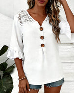 SPECIFICATIONS Top Type: Blouses Style: Casual Material: Cotton Blends Occasion: Daily Neckline: V neck_V Pattern Type: Solid Color Sleeve Type: Puff Sleeve Sleeve Length: Short Sleeve Fit Type: Regular Season: Spring,Summer Details: Lace Package Includes: 1 x Blouse SIZE TABLE Size Bust Length CM INCH CM INCH S 97 38.19 65 25.5...