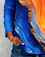 Color-Blocked V-Neck Patterned Long-Sleeved Top