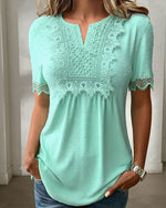 SPECIFICATIONS Top Type: Tops Style: Casual Material: Cotton Blends Occasion: Daily Neckline: V neck_V Pattern Type: Solid Color Sleeve Type: Regular sleeve Sleeve Length: Short Sleeve Fit Type: Regular Season: Spring,Summer Details: Lace Package Includes: 1 x Top SIZE TABLE Size Bust Length CM INCH CM INCH S 97 38.19 65 25.59 ...