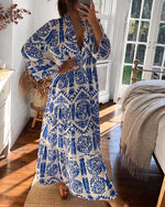 SPECIFICATIONS Style: Casual, Vacation Dress Type: A-Line Dress Length: Maxi Neckline: V neck_V Pattern Type: Print Sleeve Type: Lantern Sleeve Details: Drawstring Fit Type: Regular Material: 95% polyester, 5% spandex Season: Spring, Summer, Fall Occasion: Daily, Vacation Package Includes: 1 x Dress SIZE TABLE (cm) Size Bust Length Sho...