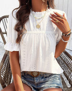 SPECIFICATIONS Top Type: Tops Style: Casual Material: 100% Cotton Occasion: Daily Neckline: Round Neck Pattern Type: Solid Color Sleeve Type: Raglan sleeve Sleeve Length: 3/4 Sleeve Fit Type: Loose Season: Spring, Summer, Fall Details: Hollow Out, Lace Package Includes: 1 x Top SIZE TABLE (cm) Size Bust Length Sleeve Length...
