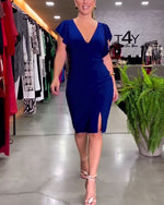 SPECIFICATIONS Style: Elegant Material: Spandex, Polyester Dress Type: Shift dress Dress Length: Knee Length Neckline: V neck_V Pattern Type: Solid Color Sleeve Type: Slit Sleeves Sleeve Length: Half Sleeve Details: Patchwork Fit Type: Regular Season: Spring, Summer Occasion: Daily Package Includes: 1 x Dress SIZE TABLE Size ...