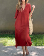 SPECIFICATIONS Style: Casual Material: Cotton Blends Dress Type: Shirt Dress Length: Maxi Neckline: V neck_V Pattern Type: Striped Sleeve Type: Dropped shoulder Sleeve Length: Short Sleeve Details: Slit Fit Type: Loose Season: Spring, Summer, Fall Occasion: Daily Package Includes: 1 x Dress SIZE TABLE (cm) Size Bust Length c...