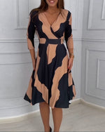 SPECIFICATIONS Style: Casual Material: 5% Spandex, 95% Polyester Dress Type: A-Line Dress Length: Knee Length Neckline: V neck_V Pattern Type: Print Sleeve Type: Flare Sleeve Sleeve Length: 3/4 Sleeve Fit Type: Regular Season: Spring, Summer Occasion: Daily Package Includes: 1 x Dress SIZE TABLE Size Bust Length Sleeve le...