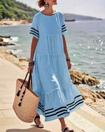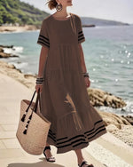 SPECIFICATIONS Style: Casual Material: Cotton Blends Dress Type: Shirt Dress Length: Maxi Neckline: V neck_V Pattern Type: Striped Sleeve Type: Dropped shoulder Sleeve Length: Short Sleeve Details: Slit Fit Type: Loose Season: Spring, Summer, Fall Occasion: Daily Package Includes: 1 x Dress SIZE TABLE (cm) Size Bust Length c...