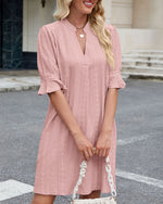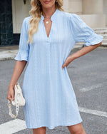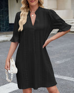 SPECIFICATIONS Style: Elegant Material: Spandex, Polyester Dress Type: Shift dress Dress Length: Knee Length Neckline: V neck_V Pattern Type: Solid Color Sleeve Type: Slit Sleeves Sleeve Length: Half Sleeve Details: Patchwork Fit Type: Regular Season: Spring, Summer Occasion: Daily Package Includes: 1 x Dress SIZE TABLE Size ...