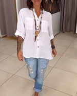SPECIFICATIONS Top Type: Tops Style: Casual Material: Cotton, Polyester Occasion: Daily Neckline: Lapel Pattern Type: Solid Color Sleeve Type: Dropped shoulder Sleeve Length: 3/4 Sleeve Fit Type: Regular Season: Spring, Summer, Fall Package Includes: 1 x Top SIZE TABLE Size Bust Length CM INCH CM INCH S 95 37.40 65 25.59 ...