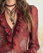 Gathered Ruffle V-Neck Long-Sleeve Blouse