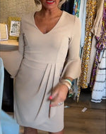 SPECIFICATIONS Style: Elegant Material: Spandex, Polyester Dress Type: Shift dress Dress Length: Knee Length Neckline: V neck_V Pattern Type: Solid Color Sleeve Type: Slit Sleeves Sleeve Length: Half Sleeve Details: Patchwork Fit Type: Regular Season: Spring, Summer Occasion: Daily Package Includes: 1 x Dress SIZE TABLE Size ...
