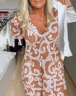 Vintage printed V-neck long-sleeve elegant dress