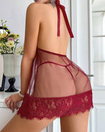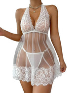 Floral Lace Halter Babydoll Lingerie Dress With Thong