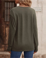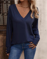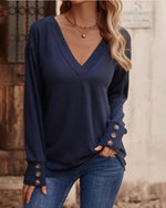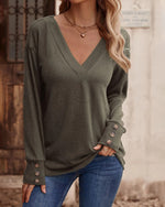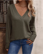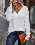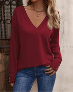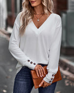 Solid color v neck button long sleeve top