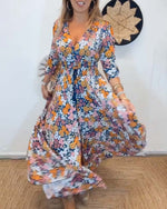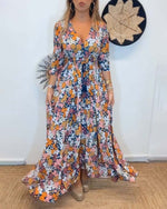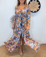 SPECIFICATIONS Style: Casual, Vacation, Boho Material: Cotton Blends Dress Type: A-Line Dress Length: Maxi Neckline: V neck_V Pattern Type: Print Sleeve Type: Flare Sleeve Sleeve Length: 3/4 Sleeve Fit Type: Regular Season: Spring, Summer, Fall Occasion: Daily, Vacation Package Includes: 1 x Dress SIZE TABLE Size Bust Length CM INCH C...