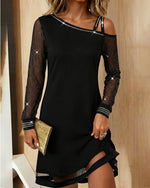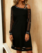 Hot-Fix Crystals Asymmetric Neckline Off-Shoulder Long Sleeve Dress
