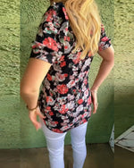 Round Neck Puff Sleeve Pleated Floral Blouse