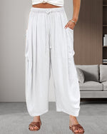 PRODUCT DESCRIPTION FEATURES: Elastic High Waist: Wide elastic waistband flexibly adapts to different waistlines, customizes comfortable feeling for you, showing your waist curve perfectly. Two Angled Side Pockets: The loose fit women's pants feature two side pockets for easy storage of your essentials to free your hands, perfect blend o...