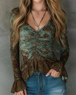 Fashionable Printed V-Neck Long-Sleeved Blouse