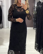 SPECIFICATIONS Style: Casual Material: Cotton Blends Dress Type: Shift dress Dress Length: Midi Neckline: Round Neck Pattern Type: Solid Color Sleeve Type: Lantern Sleeve Sleeve Length: Long Sleeve Details: Lace Fit Type: Loose Season: Fall,Winter Occasion: Daily,Party,Night Out Package Includes: 1 x Dress SIZE TABLE Size Bust Length ...
