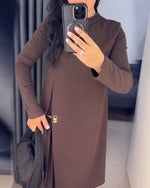 SPECIFICATIONS Category: Sweater Dresses Style: Casual Material: Acrylic,Spandex,Polyester Neckline: Lapel Sleeve Type: Dropped shoulder Dress Type: Straight Dress Length: Knee Length Sleeve Length: Long Sleeve Details: Buckle Fit Type: Regular Occasion: Daily Season: Fall,Winter Package Includes: 1 x Sweater Dress SIZE TABLE Size  Bust  ...