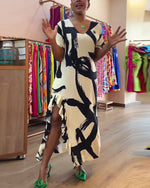 SPECIFICATIONS Style: Casual Material: Cotton Blends Dress Type: Shift dress Dress Length: Knee Length Neckline: V neck_V Pattern Type: Print Fit Type: Regular Season: Spring,Summer Occasion: Daily Package Includes: 1 x Dress SIZE TABLE Size Bust Length CM INCH CM INCH S 97 38.19 100 39.37 M 101 39.76 101.5 39.96 L 105 41.34 ...