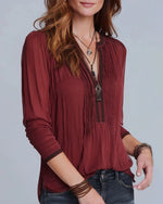 SPECIFICATIONS Top Type: Tops Style: Chic Material: Cotton Blends Occasion: Daily Neckline: V neck_V Pattern Type: Solid Color Sleeve Type: Regular sleeve Sleeve Length: Long Sleeve Fit Type: Regular Season: Spring,Summer Package Includes: 1 x Top SIZE TABLE Size Bust Length CM INCH CM INCH S 97 38.19 68 26.77 M 101 39.76 69.5 ...