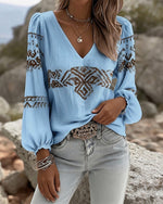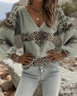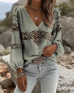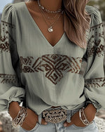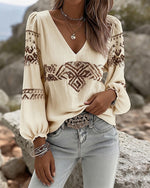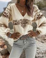 SPECIFICATIONS Top Type: Tops Style: Casual Material: Cotton Blends Occasion: Daily Neckline: V neck_V Pattern Type: Print Sleeve Type: Lantern Sleeve Sleeve Length: Long Sleeve Fit Type: Regular Season: Spring,Summer Package Includes: 1 x Top SIZE TABLE Size Bust Length CM INCH CM INCH S 97 38.19 65 25.59 M 101 39.76 66.5 26....