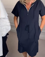 SPECIFICATIONS Style: Elegant Material: 100% Polyester Dress Type: Shift dress Dress Length: Knee Length Neckline: Round Neck Pattern Type: Solid Color Sleeve Type: Regular sleeve Sleeve Length: Short Sleeve Details: Shirred Fit Type: Regular Season: Spring, Summer Occasion: Daily, Vacation Package Includes: 1 x Dress   SIZE TABLE ...