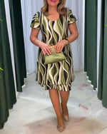 SPECIFICATIONS Style: Elegant Material: 5% Spandex,95% Polyester Dress Type: Shift dress Dress Length: Knee Length Neckline: V neck_V Pattern Type: Print Sleeve Length: Short Sleeve Fit Type: Regular Season: Spring, Summer, Fall Occasion: Daily Package Includes: 1 x Dress SIZE TABLE Size Bust Length Sleeves Shoulder ...