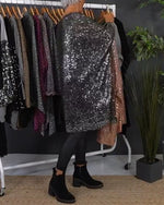 SPECIFICATIONS Style: Sexy Material: 95% Polyester, 5% Spandex Dress Type: Bodycon Dress Length: Above-knee Neckline: Cowl Neck Pattern Type: Sequin Sleeve Length: Sleeveless Fit Type: Skinny Season: Fall,Winter Occasion: Daily,Party Package Includes: 1 x Dress SIZE TABLE Size Bust Length CM INCH CM INCH S 82 32.28 85 33.46 M 87 3...