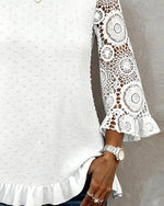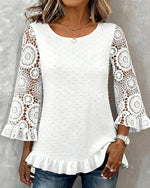 SPECIFICATIONS Top Type: Blouses Style: Casual Material: Cotton Blends Occasion: Daily Neckline: V neck_V Pattern Type: Solid Color Sleeve Type: Ruffle Sleeve Sleeve Length: 3/4 Sleeve Fit Type: Regular Season: Fall,Winter Details: Lace Package Includes: 1 x Blouse SIZE TABLE Size Bust Length CM INCH CM INCH S 97 38.19 65 25.59 ...