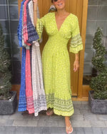 SPECIFICATIONS Style: Vacation, Elegant Material: Spandex, Polyester Dress Type: A-Line Dress Length: Maxi Neckline: V neck_V Pattern Type: Paisley Sleeve Type: Lantern Sleeve Sleeve Length: Long Sleeve Details: Shirred Fit Type: Regular Season: Spring, Summer, Fall Occasion: Daily, Vacation Package Includes: 1 x Dress SIZE TABLE ...
