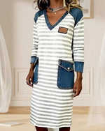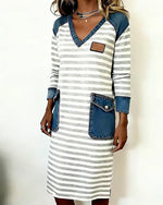 SPECIFICATIONS Style: Casual, Basics Material: 5% Spandex, 95% Polyester Dress Type: A-Line, Shift dress Dress Length: Knee Length Neckline: Round Neck Pattern Type: Color Block Sleeve Type: Regular sleeve Sleeve Length: Long Sleeve Details: Patchwork, Pocket Fit Type: Regular Season: Spring, Fall, Winter Occasion: Daily Package Includes: 1 x...