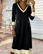 SPECIFICATIONS Style: Casual, Basics Material: 5% Spandex, 95% Polyester Dress Type: A-Line, Shift dress Dress Length: Knee Length Neckline: Round Neck Pattern Type: Color Block Sleeve Type: Regular sleeve Sleeve Length: Long Sleeve Details: Patchwork, Pocket Fit Type: Regular Season: Spring, Fall, Winter Occasion: Daily Package Includes: 1 x...