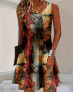 FEATURES Elegant V-neck design: The elegant V-neck design perfectly highlights the charming neck line, adding a touch of elegance and charm to the overall look. Exquisite prints: The unique and exquisite prints are like works of art embellishing the skirt, making you the focus wherever you go, showing your fashion taste. Chic knot details: T...