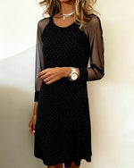 SPECIFICATIONS Style: Elegant, Business Material: 95% polyester, 5% spandex Dress Type: Shift dress Dress Length: Knee Length Neckline: Round Neck Pattern Type: Solid Color Sleeve Type: Regular sleeve Sleeve Length: Long Sleeve Details: Patchwork, See-through Fit Type: Regular Season: Spring, Fall, Winter Occasion: Daily, Work Package Include...