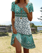 FEATURES Elegant V-neck design: The elegant V-neck design perfectly highlights the charming neck line, adding a touch of elegance and charm to the overall look. Exquisite prints: The unique and exquisite prints are like works of art embellishing the skirt, making you the focus wherever you go, showing your fashion taste. Chic knot details: T...