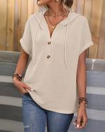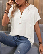 Button Batwing Sleeve Drawstring Hooded Top