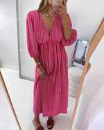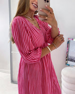 V-neck Lantern Sleeve Striped Dress