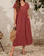 SPECIFICATIONS Style: Elegant Material: Cotton Blends Dress Type: A-Line Dress Length: Maxi Neckline: V neck_V Pattern Type: Leaves Sleeve Type: Puff Sleeve Sleeve Length: Short Sleeve Details: Shirred Fit Type: Regular Season: Spring, Summer Occasion: Daily, Vacation Package Includes: 1 x Dress SIZE TABLE Size US Bust Lengt...