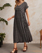 FEATURES Elegant V-neck design: The elegant V-neck design perfectly highlights the charming neck line, adding a touch of elegance and charm to the overall look. Exquisite prints: The unique and exquisite prints are like works of art embellishing the skirt, making you the focus wherever you go, showing your fashion taste. Chic knot details: T...