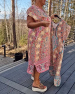 SPECIFICATIONS Style: Elegant Material: Cotton Blends Dress Type: A-Line Dress Length: Maxi Neckline: V neck_V Pattern Type: Leaves Sleeve Type: Puff Sleeve Sleeve Length: Short Sleeve Details: Shirred Fit Type: Regular Season: Spring, Summer Occasion: Daily, Vacation Package Includes: 1 x Dress SIZE TABLE Size US Bust Lengt...